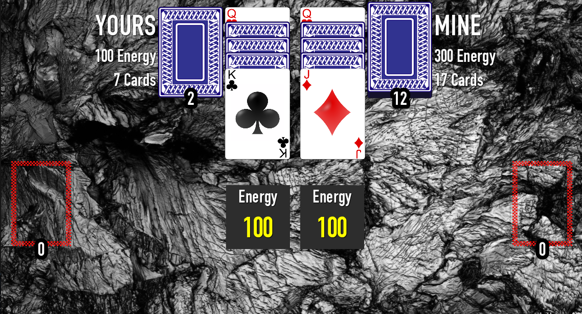 After some research, I learned about the Casino War variation. I didn’t want to have a betting mechanic, but I was inspired by the idea of influencing the outcome by applying resources. There’s no psychological modeling or bluffing here; if you add more resources, the opponent has to match. If you run out of resources or cards, you lose. This works, but it’s still not a meaningful choice, and I feel player agency is very important. It still felt like it was lacking something.